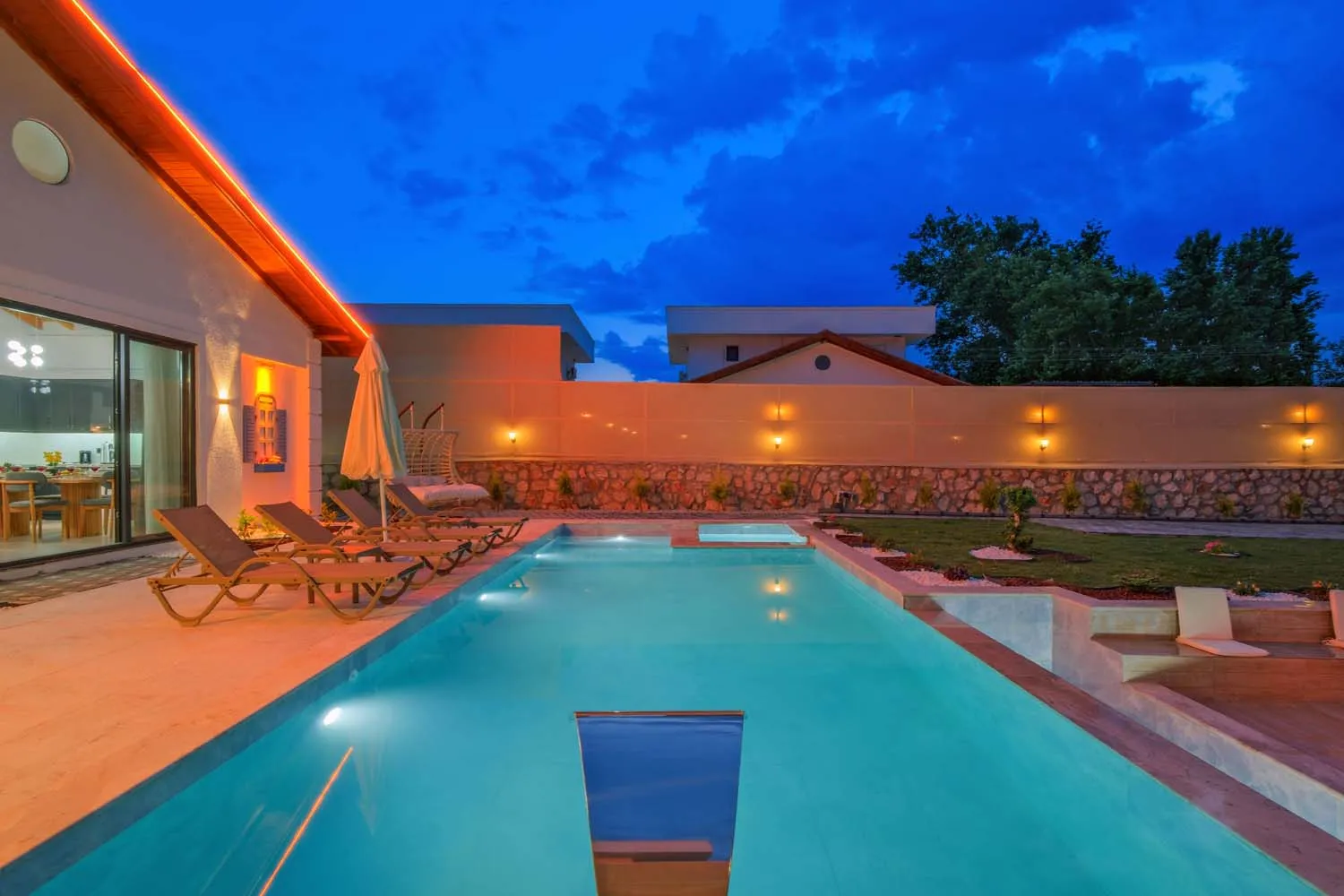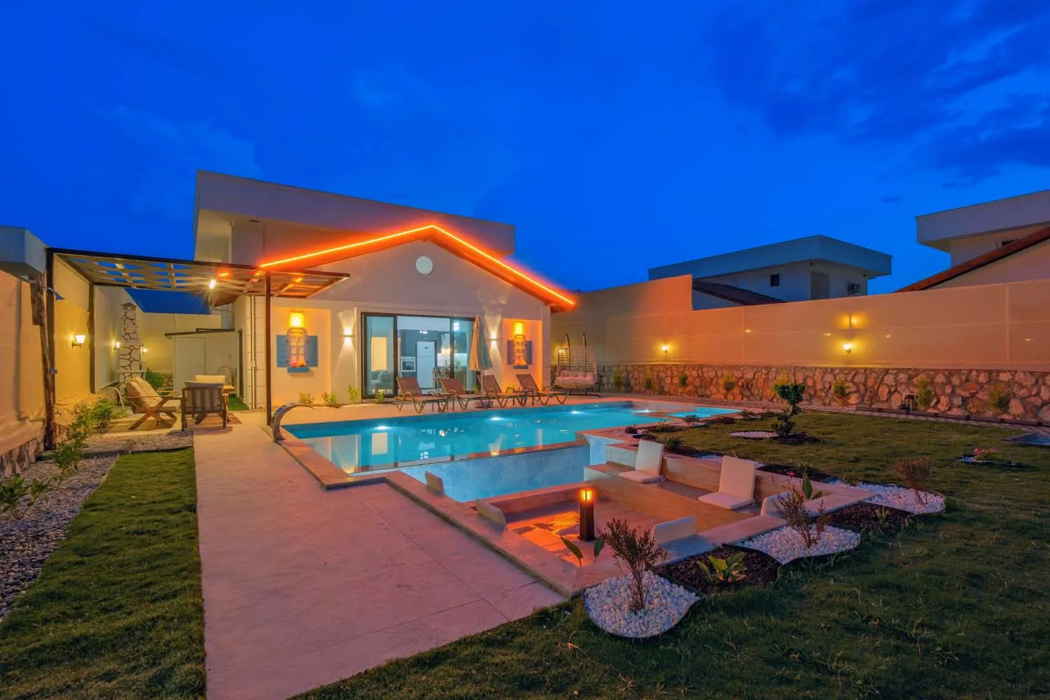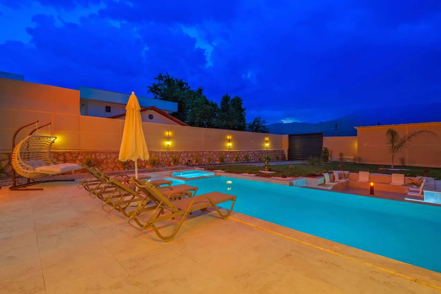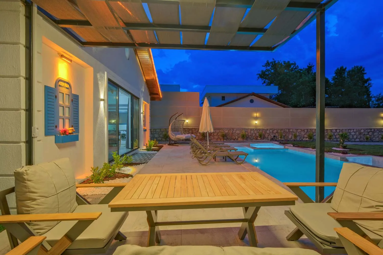 Dış mekanda; oturma alanları, şezlonglar, havuz içi jakuzi, ateş çukuru ve barbekü alanı bulunurken, iç mekanda ise havuz terasına açılan konforlu oturma odası ve tam donanımlı mutfak yer almaktadır.